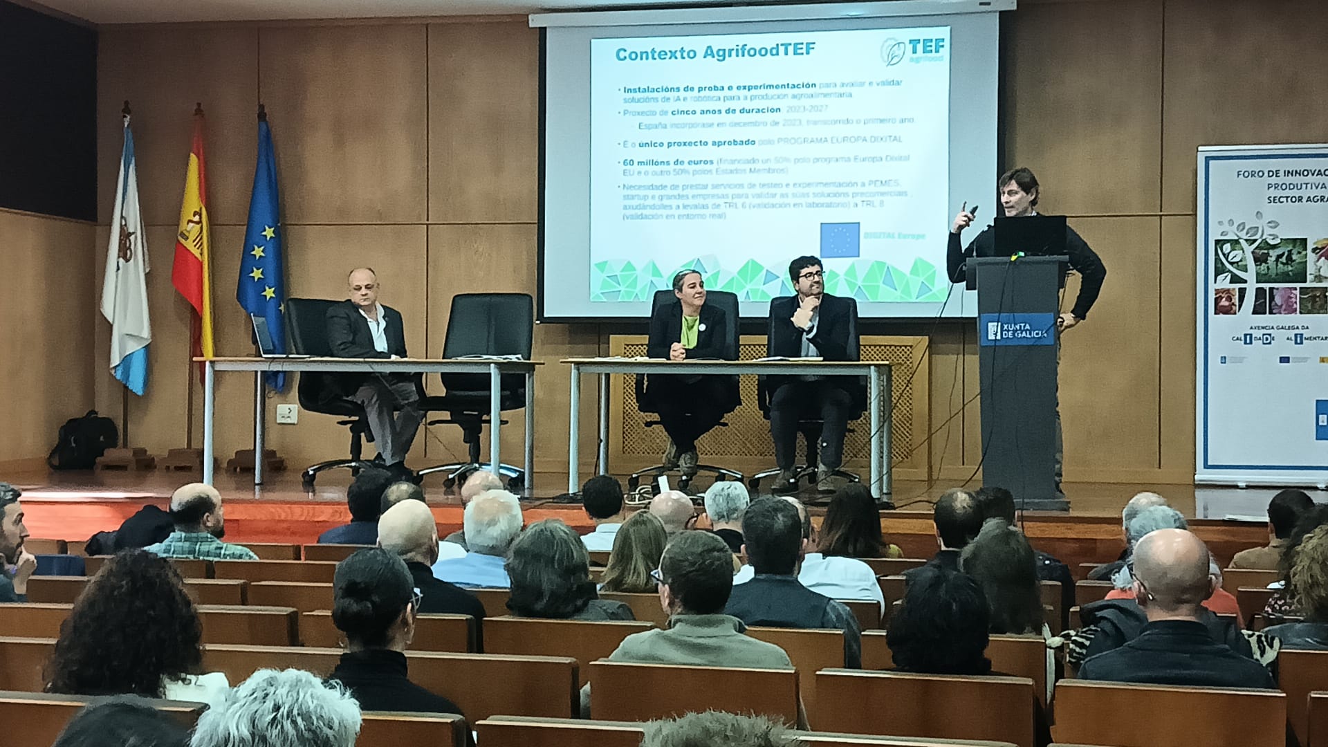 Durante el encuentro se reservó un espacio para realizar la presentación del proyecto europeo AgrifoodTEF que ofrece servicios que ayudan a evaluar y validar soluciones de Inteligencia Artificial y robótica de empresas, especialmente pymes, en condiciones reales para maximizar el impacto de la digitalización en el sector agroalimentario y forestal.